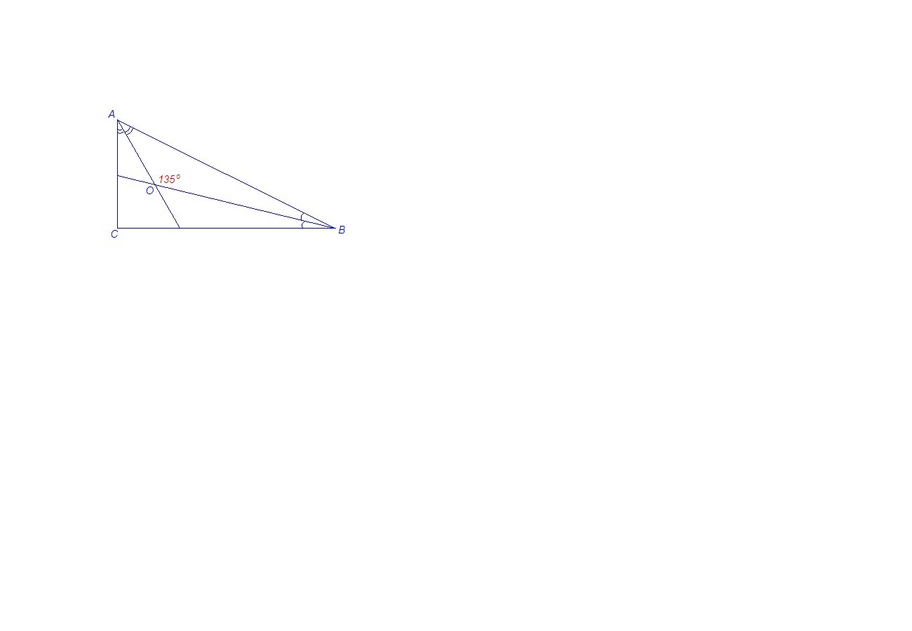 2. Сумма острых углов прямоугольного треугольника равна 90°. Тогда сумма их половинок равна 45°.∠АОВ = 180° - 45° = 135°.