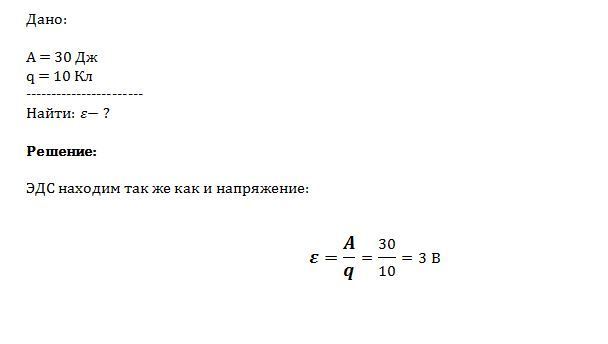 какова ЭДС источника если сторонние силы совершают работу равную 30 Дж при перемещении 10 Кл электричества внутри источника от одного полюса к другому