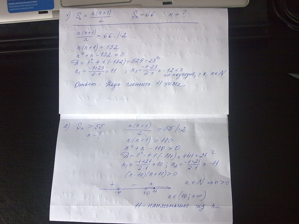 Сумму n последовательных чисел можно вычислить по формуле Sn=n(n+1)/2 , Определите, сколько чисел, начиная с одного , надо сложить, что в сумме получилось 66. Какое наименьшее число последовательных чисел от 1 до n надо сложить, чтобы их сумма была больше 55?