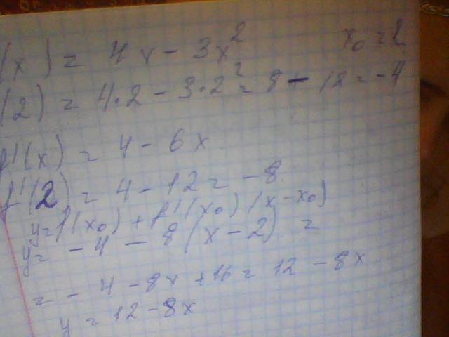 напишите уравнение касательной к графику функции f(x)=4х-3х2 проведенной в точке с абциссой х0=2