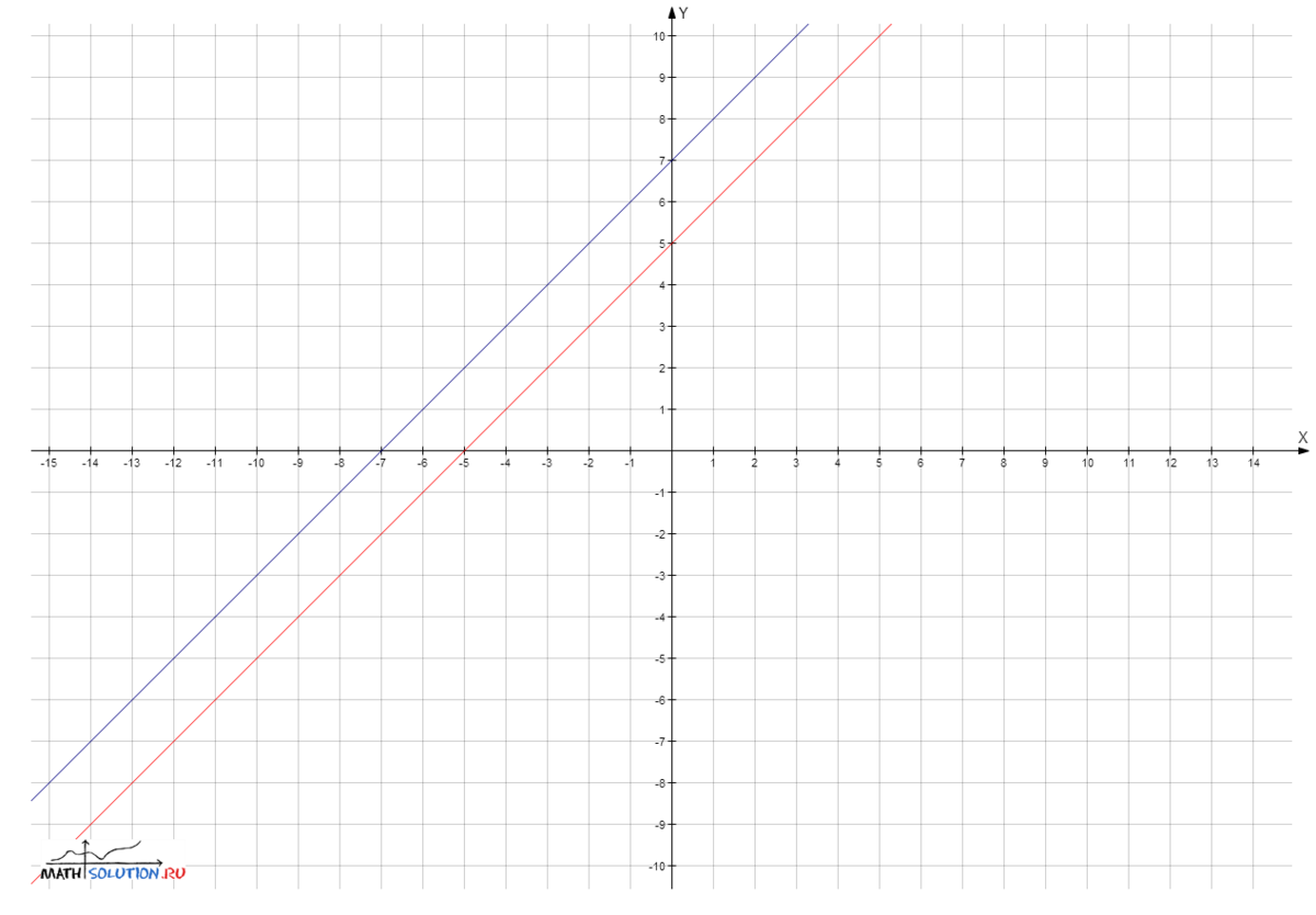 у данных прямых нет точек пересечения. общая функция для этих прямых имеет вид f(x)=x. прямые расположены в одних и тех-же координатных четвертях. они параллельны. отличаются только точками пересечения с осью оУ: (0;5) и (0;7) соответственно.