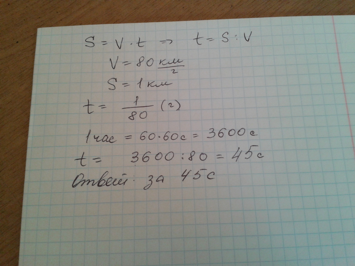 решите задачу пользуясь формулой s=√t: скорость движущегося автомобиля по шоссе80км/ч за сколько секунд он проезает растояние между соседними километровыми столбами?