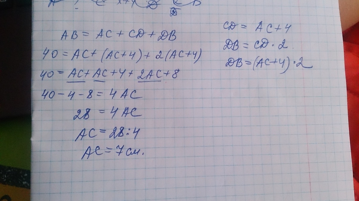 Длина отрезка АБ равна 40см. . Точки С и Д делят отрезок АБ на отрезки АС СД и ДБ . Длина отрезка СД на 4 см. больше, чем длина отрезка АС но в 2 раза меньше чем длина отрезка ДБ . Помогите найти длину отрезка АС.