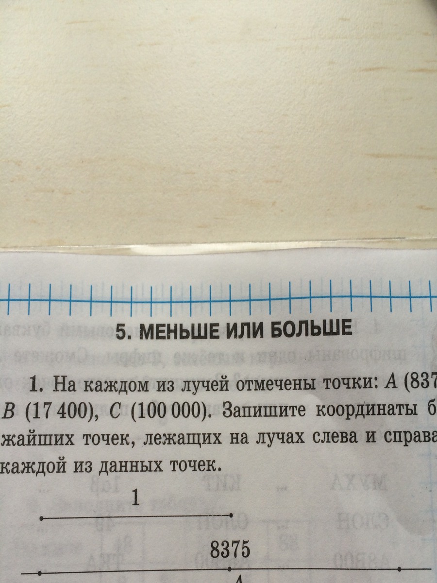 На каждом из лучей отмечены точки:A (8375), B (17 400), C (100 000). Запишите координаты ближайших точек,лежащих на лучах слева и справа от каждой из данных точек