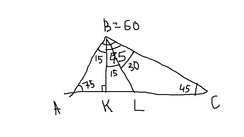в треугольнике abc угол A равен 75 угол c равен 45.найдите угол KBl где Bk-высота данного треугольника bl его биссектриса