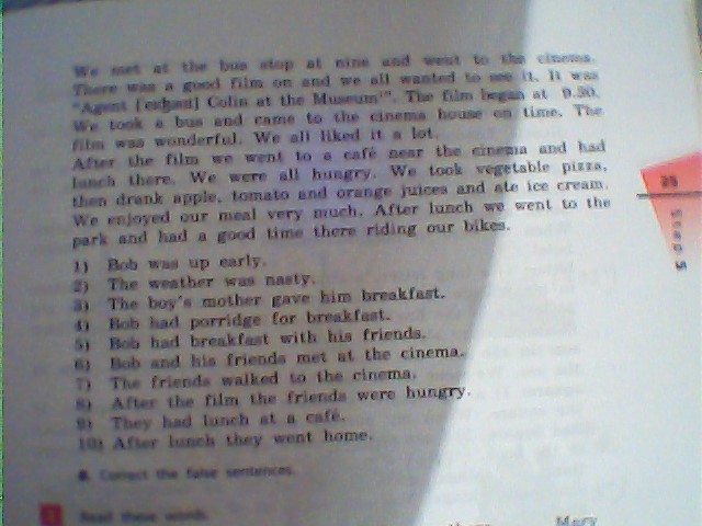 Привет,Меня зовут Боб,Боб Вильсон.Мои каникулы вчера начались.Это был прекрасный день.Я проснулся утром.Погода была отличная.Я был счастлив.Я пошёл в ванную и принял душ.Я оделся и пошёл на кухню.Моя мамадала мне завтрак-немного салата,кашу и сэндвич.Я выпил кофе с молоком т был готов для ранней прогулки с моими друзьями. Мы были все свободны не для школы и классу.