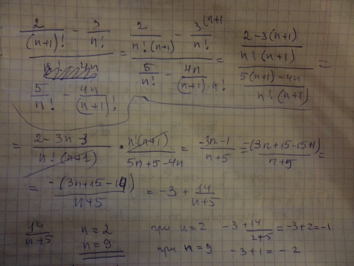 Помогите пожалуйста, очень срочно надо ! При каком натуральном значении n значение выражения (2/( n+1)!-3/n!)/(5/ n!-4n/(n+1)! является целым числом? Р.S. n! - это энфакториал