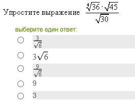 frac{ sqrt[4]{36} sqrt{45}  }{ sqrt{30} } = frac{  sqrt{6} sqrt{45}  }{ sqrt{30} }= sqrt{ frac{6*45}{30}} = sqrt{9} =3