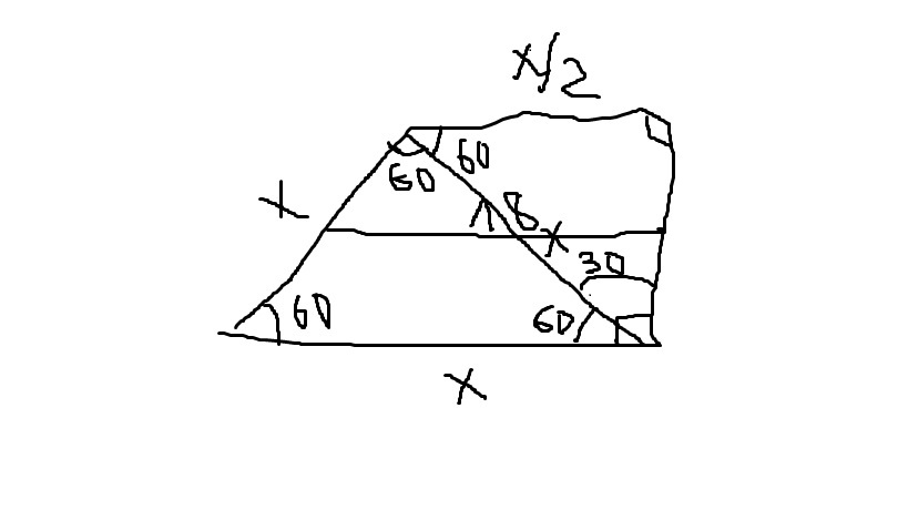 в равностороннем треугольнике обозначим за х большее основание боковую сторону и диагональ...тогда во втором треугольнике меньшее основание будет х/2 как катет против угла 30 градусов..отсюда имеем...