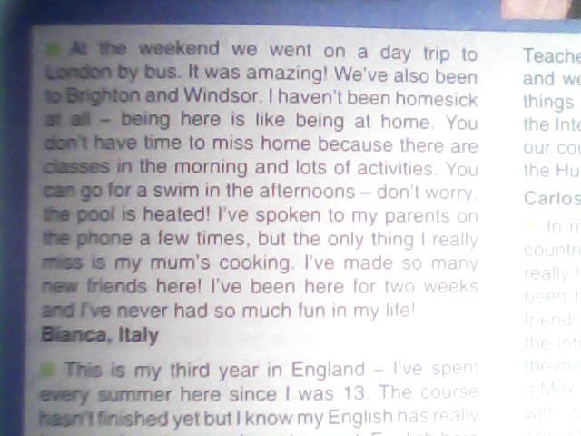 На выходных мы ездили на однодневную екскурсию в лондон. Это было замечательно. Мы были ... и ... Я не скучал по дому- тут я был как дома. ты не имеешь времени скучать по дому потому что много занятий утром .Ты можешь пойти поплавать вечером- не переживай, басейн нагревается. Я говорил с моими родителями по телефону несколько раз, но была лишь одна вещь по которой я скучал это мамина еда. Я нашел много новых друзей тут. Я был тут две недели и мне никогда не было там весело в жизни.