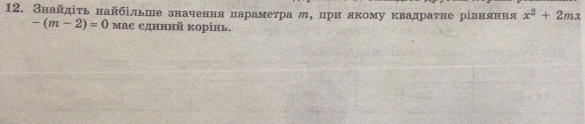 Когда m рано 1 или -2, у нашего исходного квадратного уравнения будет один корень. Наибольшее m=1.