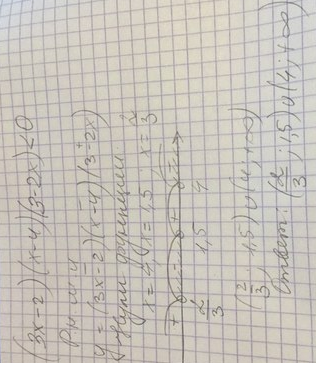 Нули функции будут в точках: 4; 1,5; 2/3 (просто приравнять уравнения в скобках к нулю)