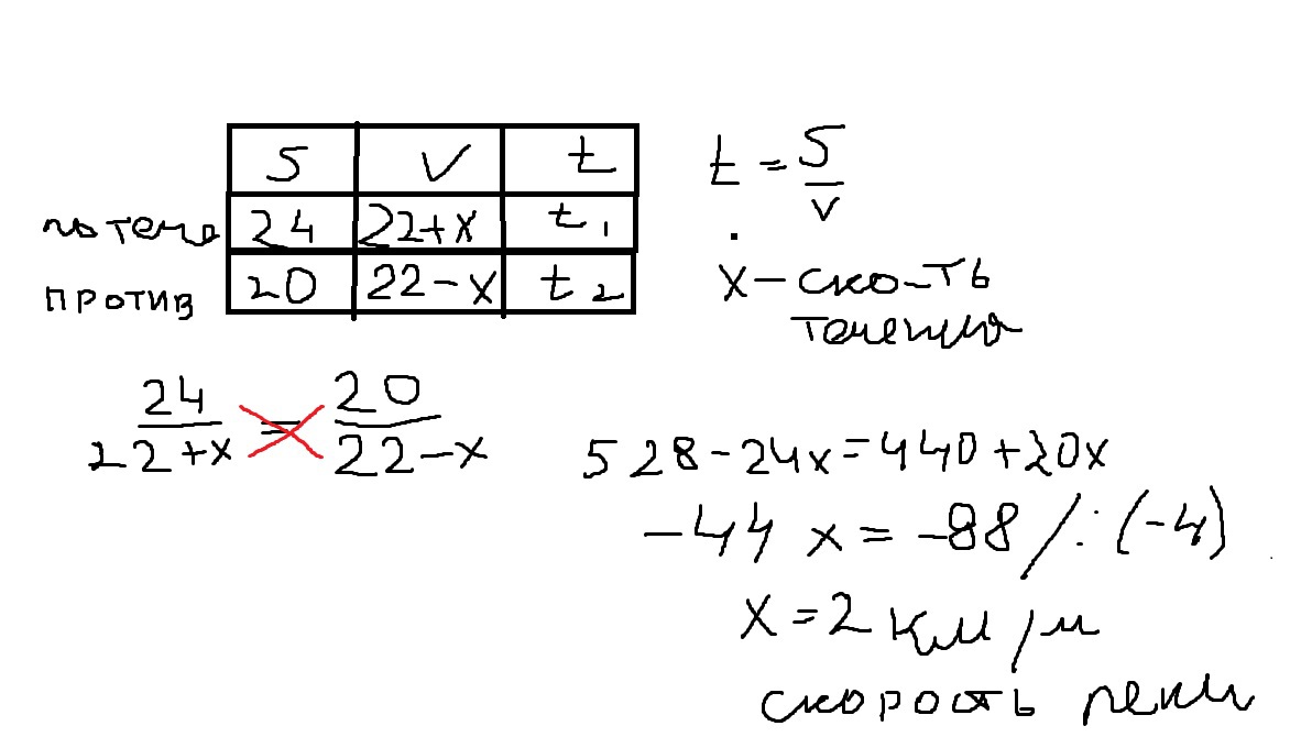 Катамаран по течению реки проплывает 24 км за такое же время, что и 20 км против течения. Какова скорость реки, если скорость катамарана 22 км/ч