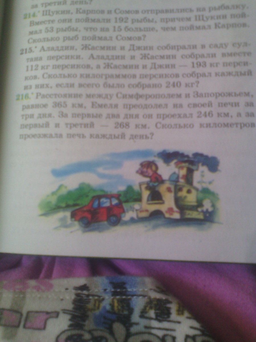 Расстояние между Симферополем и Запорожьем, равное 365 км, Емеля преодолел на своей печи за три дня. За первые два дня он проехал 246 км, а за первый и третий - 268 км. Сколько километров проезжала печь каждый день?