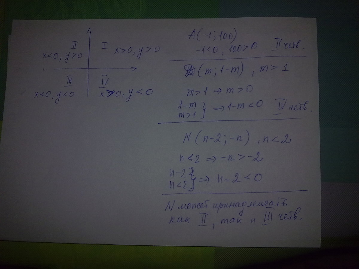 Какой координатной четверти принадлежит точка: А (-1;100) D (m; 1-m) при m > 1 N ( n-2; -n) если n < 2