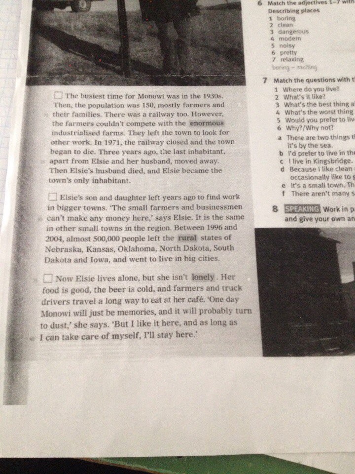 The busiest time for Monowi was in the 1930s.Then,the population was 150,mostly farmers and their families.There was a railway too.However the farmers couldnt compete with the enormous industrialised farms.They left the town to look for other work.In 1971,the railway closed and the town began to die:three yeasrs ago,the last inhabitant,apart from Elsie and her husband,moved away.Then Elsie's husband died,and Elsie became the town'S only inhabitant.Elsie's son and daughter left years ago to find work in bigger towns.'The small farmers and businessmen cant make any money here.'says Elsie.İt is the same in other small towns in the region.Between 1996 and 2004,almost 500.000 people left the rural states of Nebraska,Kansas,Oklahoma,North Dakota,South Dakota and Lowa,and went to live in big cities.
