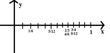 Отметить на луче точки с координатами 3/4; 1/6; 5/12; 2/3; 9/12; 4/6
