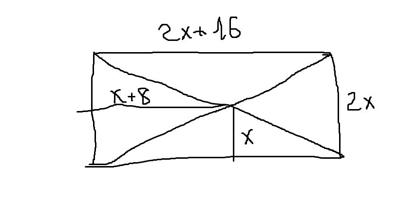 Расстояние от точки пересечения диагоналей до его меньшей стороны на 8 сантиметров больше чем расстояние до большей стороны. Найдите стороны прямоугольника если его периметр равен 72 сантиметра