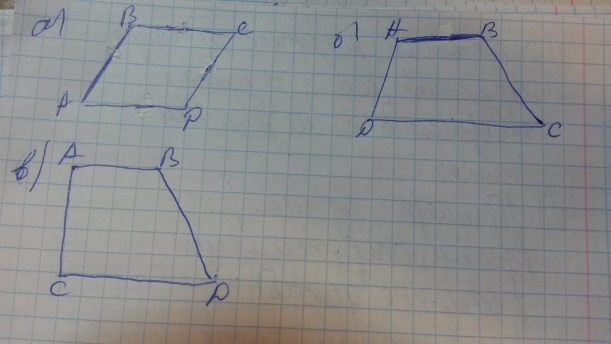 постройте какой нибудь четырех угольник abcd у которого а)AB || CD и BC ||AD б)AB || CD и BC не будет || AD в) AB || CD,AB_I( Я не умею ставить этот знак , но палочка должна быть на верху черточки ) CD и BC не будет || AD