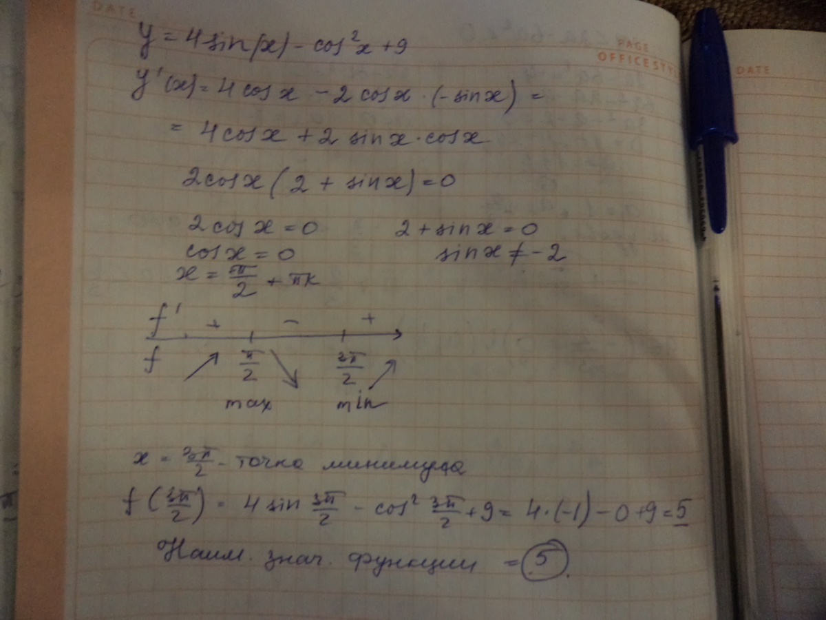 y(3π/2)=4sin3π/2-cos²3π/2+9=4*(-1)-0+9=-4+9=5