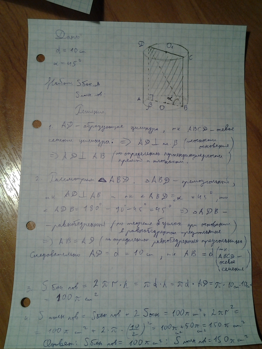 Диаметр основания цилиндра равен 10 см. Угол между диагональю осевого сечения и основанием цилиндра равен 45 градусов. Найти площадь боковой и полной поверхности цилиндра. (Отмечу лучший ответ с пояснением и желательно с чертяжем цилиндра)