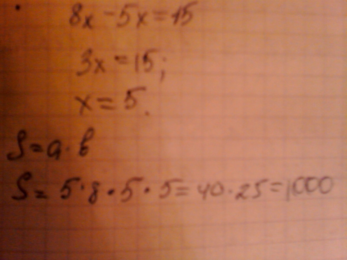 Отношение длин сторон прямоугольника равно 8 : 5. Найдите площадь этого прямоугольника , если разность его сторон равна 15см.