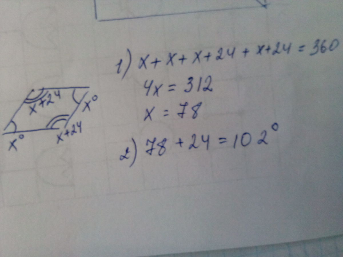 В параллелограме противолежащие углы равны. Значит 2 углы будут равны x, а 2 остальных x+24. Складываем все "углы" и приравниваем к 360°. Получаем угол, который отметили как x