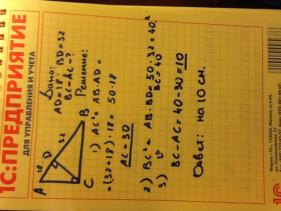 В треугольнике ABC высота CD,проведённая из вершины прямого угла,делит гипотенузу AB на отрезки AD=18 см и BD=32 см.На сколько катет BC больше катета AC