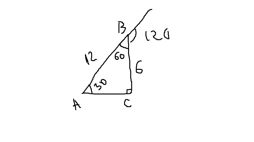 В треугольнике АВС угол С=90 градусов, АВ=12. Внешний угол при вершине В равен 120 градусов. Найдите ВС.