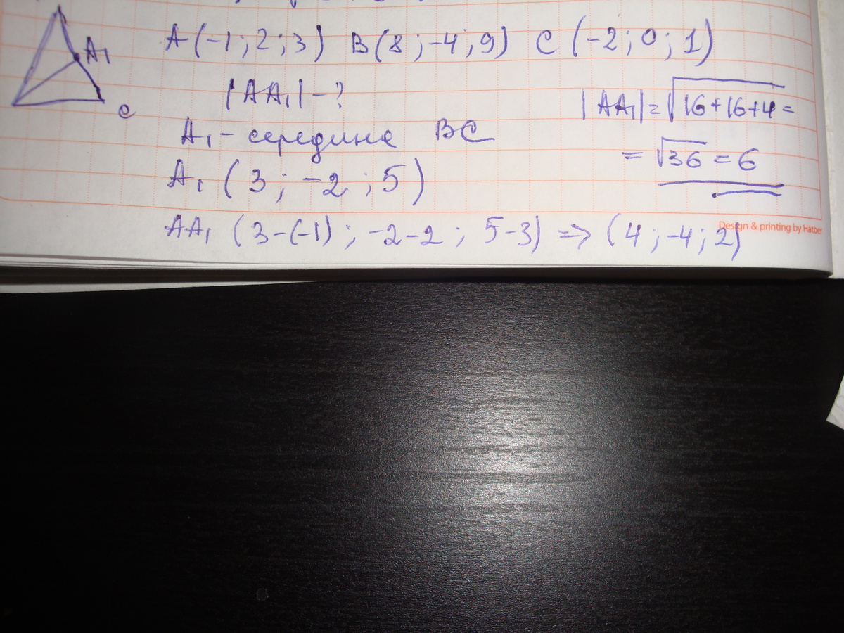 7. Найдите длину медианы АА1 треугольника АВС, если: А (-1; 2; 3), В (8; -4 9), С (-2, 0, 1).