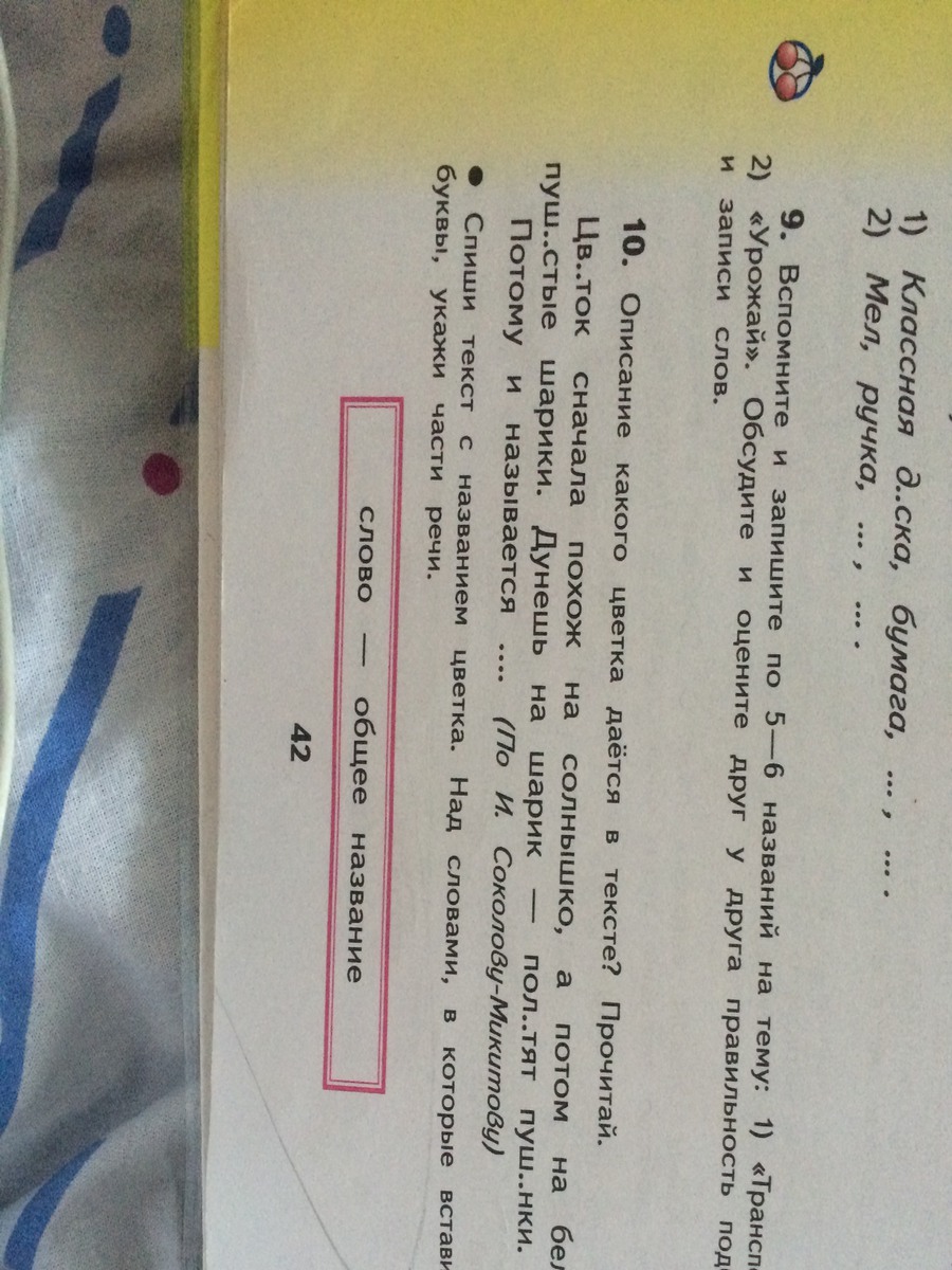 Цветок(имя.сущ) сначала похож на солнышко,а потом на белые пушистые(имя прилагат) шарики.Дунешь на шарик-полетят(глагол) пушинки(имя сущ).