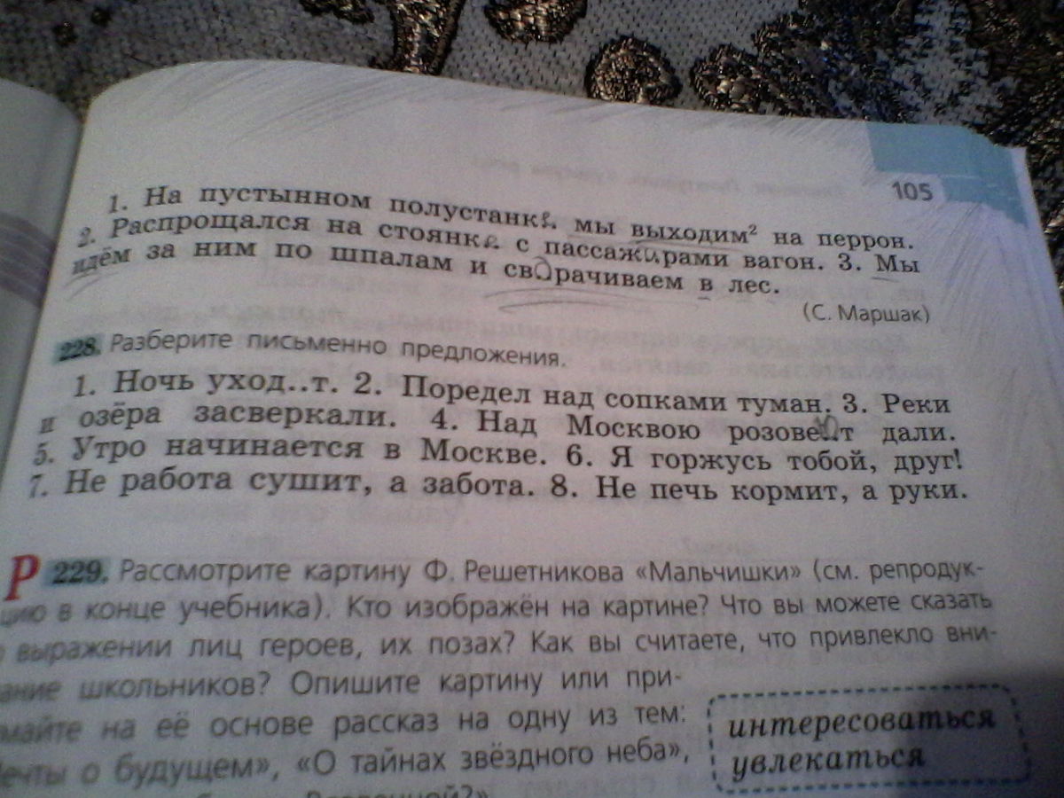 Ночь уходит.(повествовательное, невосклицательное, простое, нераспространённое, двухсоставное)Реки и озёра сверкали.(повествовательное, невосклицательное, простое, осложнённое однородными подлежащими, нераспространённое, двухсоставное)Над Москвою разовеют дали.(повествовательное, невосклицательное, простое, распространённое, двухсоставное)Утро начинается в Москве.(повествовательное, невосклицательное, простое, распространённое, двухсоставное)Я горжусь тобой, друг!(повествовательное, восклицательное, простое, осложнённое обращением, распространённое, двухсоставное)Не работа сушит, а забота.(повествовательное, невосклицательное, сложносочинённое предложение с двумя грамматическими основами , нераспространённое, первое простое предложение двухсоставное, второе - односоставное)Не печь кормит, а руки.(повествовательное, невосклицательное, сложносочинённое предложение с двумя грамматическими основами , нераспространённое, первое простое предложение двухсоставное, второе - односоставное)