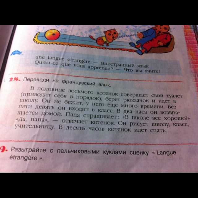 À sept heures et demie le chaton fait sa toilette (s'amène l'ordre), prend le sac et va à l'école. Il ne court pas, il a encore beaucoup de temps. À neuf heures moins cinq il entre dans la classe. À deux heures il revient chez soi la maison. Le père demande : "Tout est bien ?" "Oui, le papa", - le chaton répond. Il dessine l'école, la classe et le professeur. À dix heures le chaton va dormir