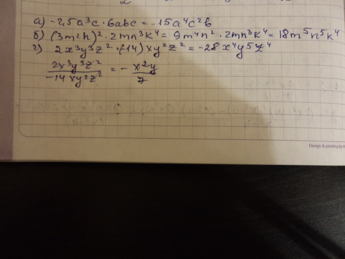 2)Найдите произведения и частное одночленов: 2х³y³z ² и -14хy² z²
