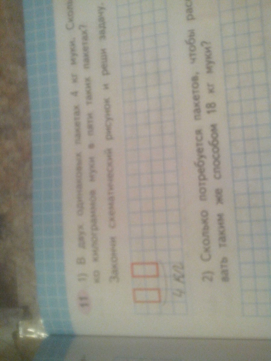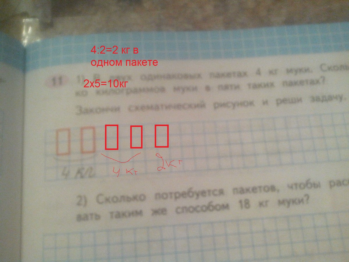 в двух одинаковых пакетах 4кг муки.сколько килограмов муки в пяти таких пакетах. закончи схематитически рисунок и реши задачу