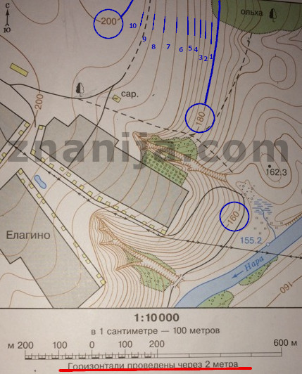 Соответственно, высота в 20 метров (200 - 180 = 20) обозначена 10-ю горизонталями, т.е. 20/10 = 2 метра.