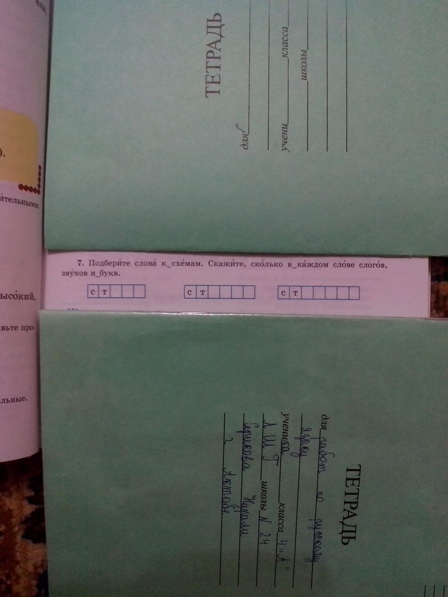 Подберите слова к схемам. Скажите, сколько в каждом слове слогов, звуков и букв.