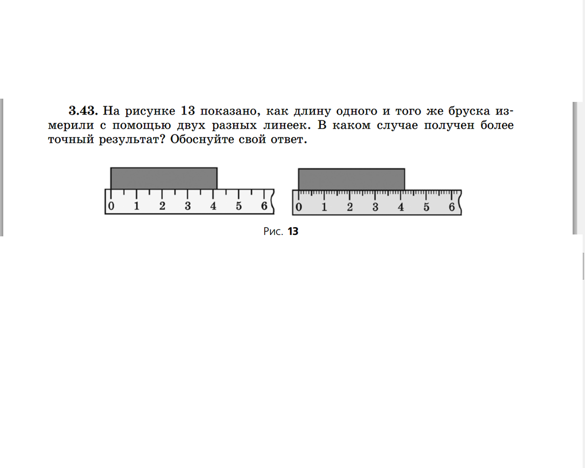 На рисунке 13 показано, как длину одного и того же бруска измерили с помощью двух разных линеек. В каком случае получен более