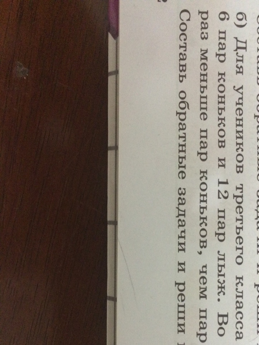 1) 12:6=2 во столько раз меньше пар коньков, чем лыж ОБРАТНЫЕ ЗАДАЧИ: 1)...купили 6 пар коньков, а пар лыж в 2 раза больше. Сколько пар лыж купили? 6*2=12 пар лыж купили 2).......купили 12 пар лыж, а пар коньков в 2 раза меньше. Сколько пар коньков купили? 12:2=6 пар коньков купили.