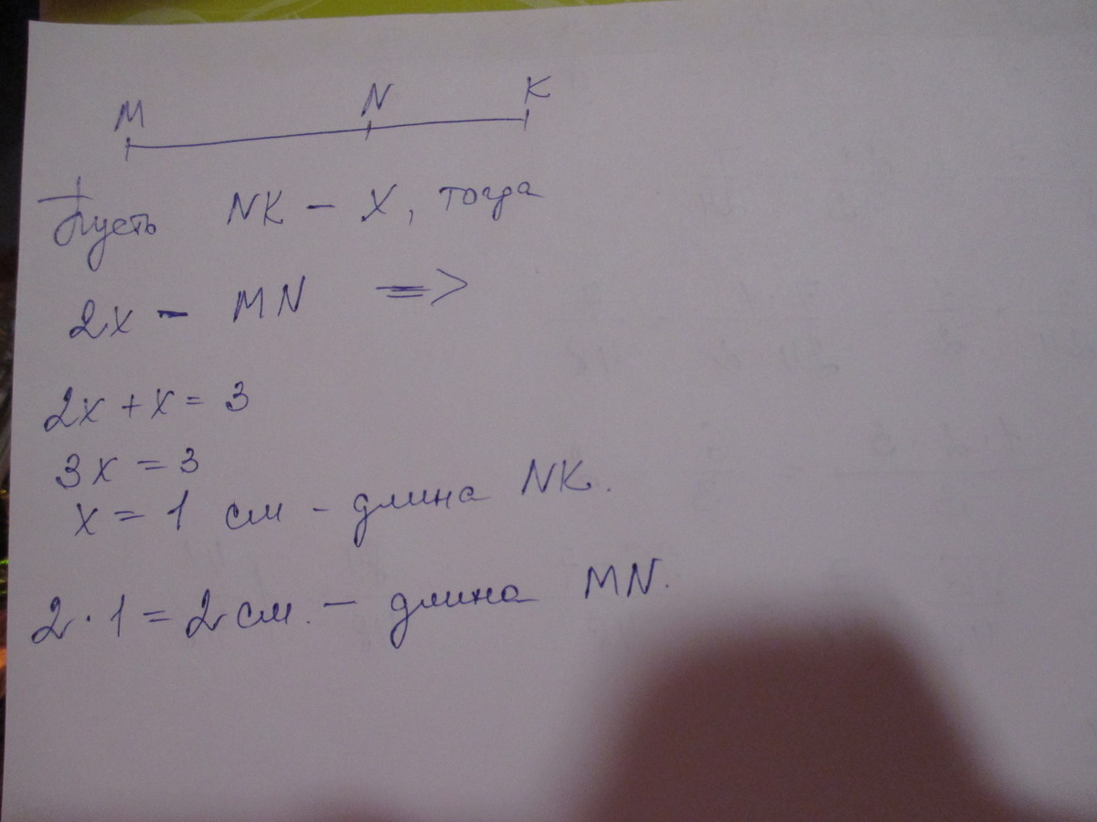 На отрезке MK отметили точку N так,что расстояние между точками M и N в 2 раза больше,чем расстояние между точками N и K. Найдите расстояние между точками M и N и N и K,если расстояние между точками M и K равно 3 см