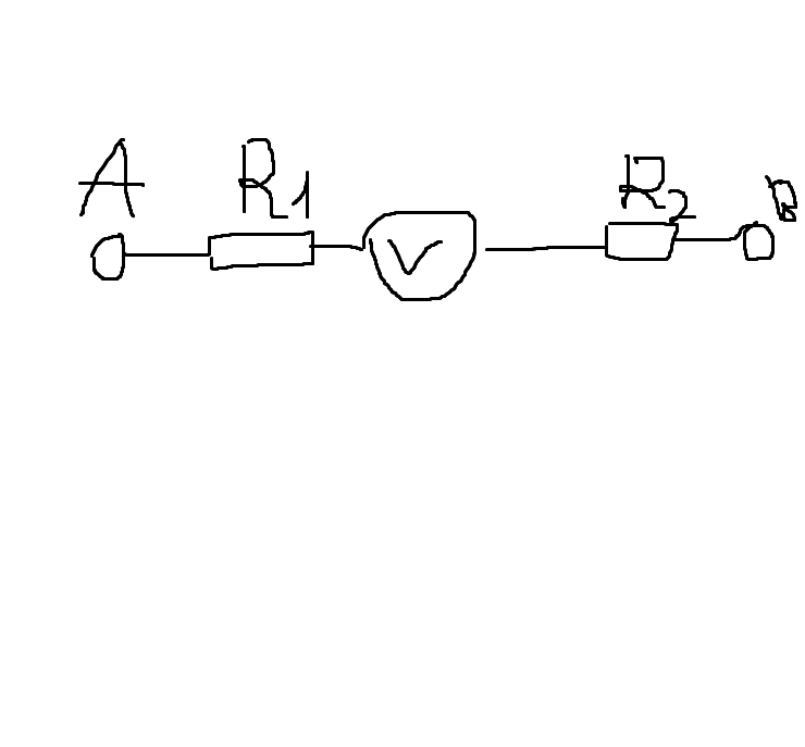 На участке цепи (рис.) напряжение UАВ = 24 В, сопротивления R1 = 4 Ом, R2 = 46 Ом, сопротивление вольтметра RV = 110 Ом. Определить показания вольтметра.