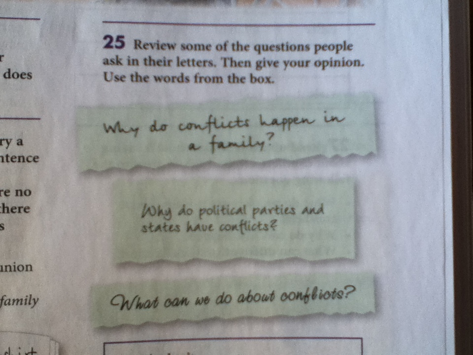 Our life now is so difficult. We may have problems with money, with partners, at home and so on. We become nervouse. That is why conflicts happen in a family. People cry and argue and spoil relations. They don't want to listen to each other.
