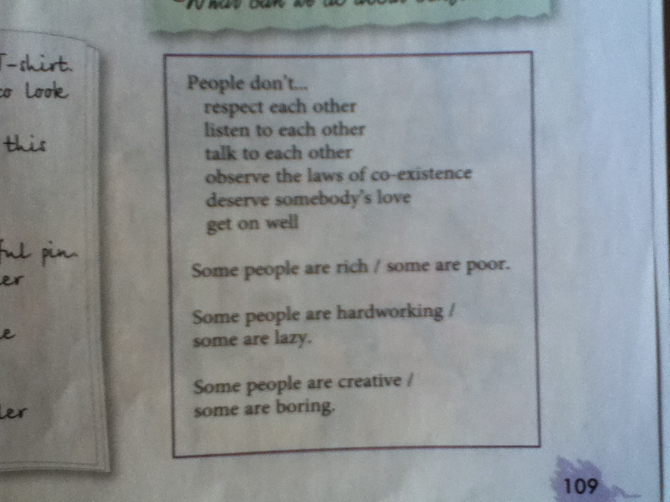 I think we must respect each other . Some people are rich, some are poor. Some people are hardworking, some are lazy. Some people are creative, some are boring. We must be patient. We must listen to each other. We must observe the laws of co-exostance.