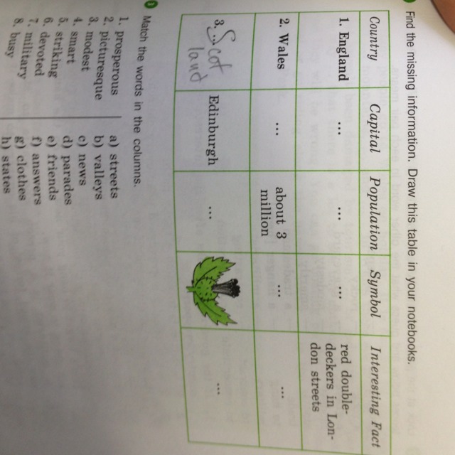 England, capital - London, population - about 53 million, symbol - the Tudor rose. Wales, capital - Cardiff, symbols - daffodil and the leek, interesting facts - popular hobby in Wales is dancing, highest peak - mountain Snowdon. Scotland, population - about 5 million, interesting facts - Scotland is made up of more than 790 islands.