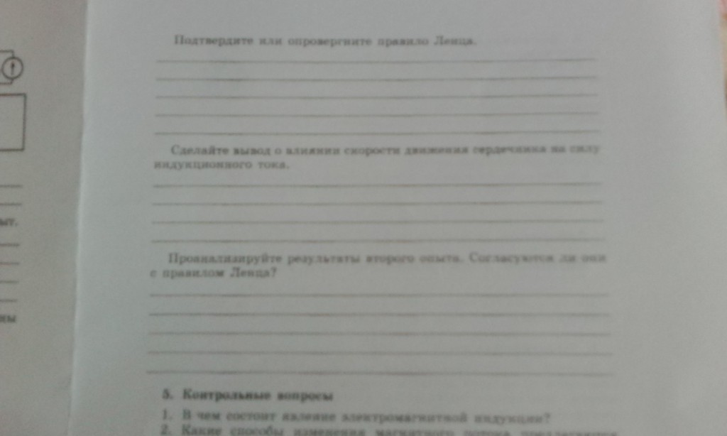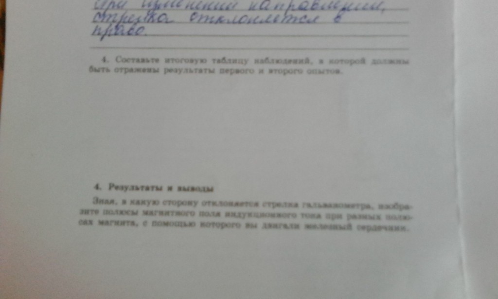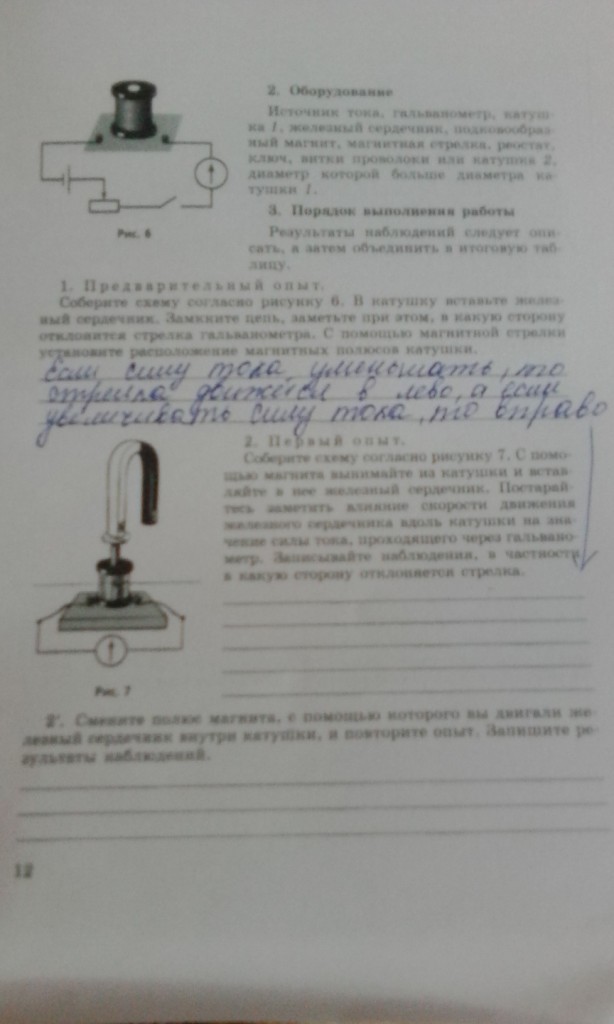 Помогите, пожалуйста. С физикой не дружим. Предварительный опыт . Соберите схему согласно рисунку 6. В катушку вставьте железный сердечник. Замкните цепь, заметьте при этом, в какую сторону откланяется стрелка гальванометра. С помощью магнитной стрелки установите расположение магнитных полюсов катушки. 2 задание. Смените полюс магнита, с помощью которого вы двигал железный сердечнк внутри катушки и повторите опыт.4 составьте итоговую таблицу наблюдений, в которой должны быть отражены результаты первого и второго опытов. Подтвердите или опровергните правило Ленца. Сделайте вывод о влияния скорости движения сердечника на силу индивидуального тока. Проанализируйте результаты второго опыта. Согласуется ли он с правилом Ленца