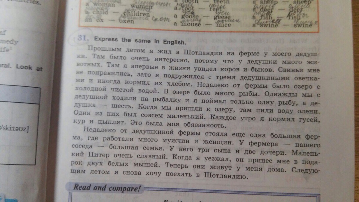 There was another large farm, near the grandfather's farm , where a lot of men and women worked. Our neighbour farmer has a large family. He has 3 sons and 2 daughters. Little Peter is very nice. When I was leaving he brought me a present of two white mice. They live at my house now. Next summer I want to go to Scotland again.
