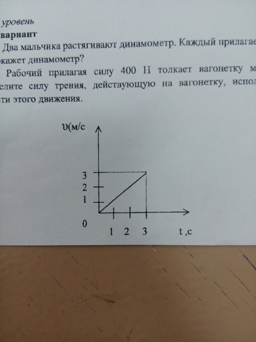 рабочий прилагая силу 400H толкает вагонетку массой 0.3 т. определите силу трения, действующую на вагонетку, используя график скорости этого движения