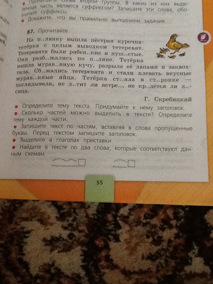 2. Тема текста-тетерята едят. 1)Вышли тетерка и тетерята. 2)Тетерка нашла еду и кормит птенцов