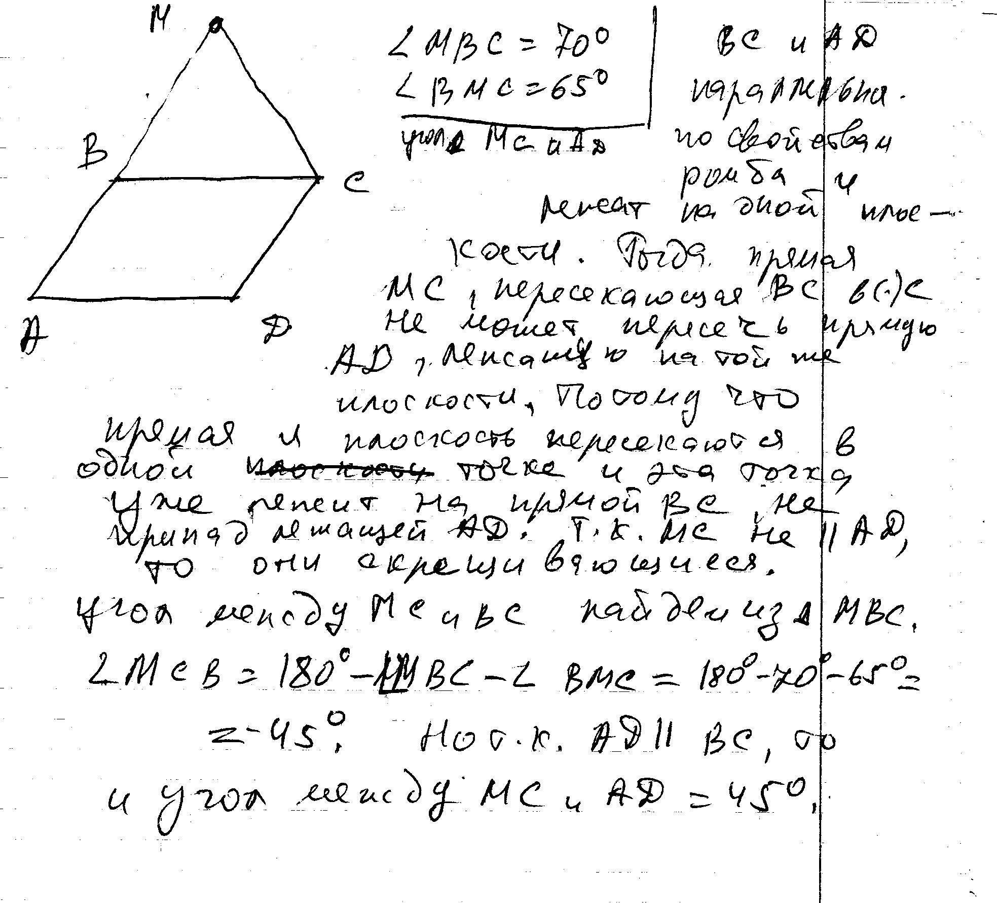 точка М не лежит плоскости ромба АВСД а)докажите что МС и АД скрещивающиеся прямые б) найдите угол между МС и АД ,если угол МВС =70 угол ВМС=65