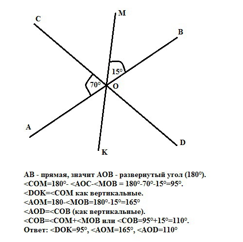 прямые AB, CD и MK пересекаются в точке O. угол AOc=70 градуса, угол MOB=15 градуса. найдите угол DOK, угол AOM и угол AOD.